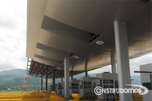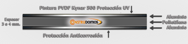 Caracteristicas, el Panel de Aluminio es un innovador material compuesto, que consta de dos láminas de aluminio unidas a un núcleo de polietileno y recubierto de diversas capas de pintura PVDF-Kynar, la cual brinda una alta resistencia a los efectos climatológicos, protegiendo por más de 10 años el color al ser expuesto a los rayos ultra violeta y las inclemencias del clima.